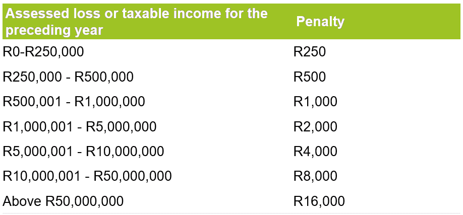 If a taxpayer is non-compliant in a particular area of their tax affairs, such as income tax for your Company or Personal (CIT or PIT), value-added tax (VAT), or Pay as You Earn (PAYE), SARS may impose monthly administrative penalties as shown below;